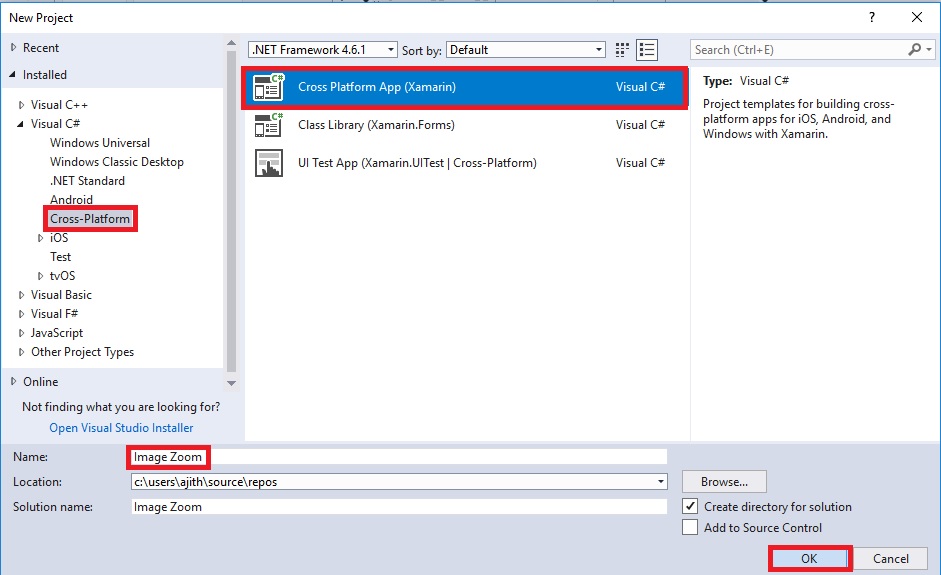 Open Visual Studio and go to New Project >> Installed >> Visual C# >> Cross-Platform.