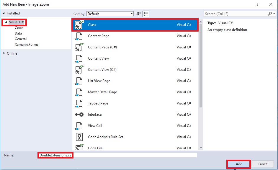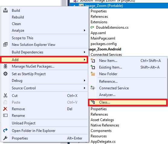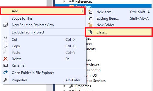 Now, go to Open Solution Explorer >> Project Name (Portable) >> Extensions >> Right-Click >> Add >> Class. When you click the class button it will open the dialogue.