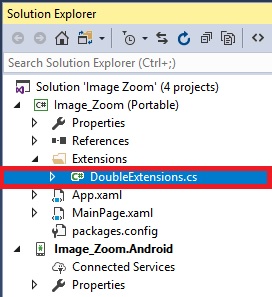 Next, go to Open Solution Explorer >> Project Name (Portable) >> Extensions >> DubleExtensions.cs >> Left-Click in Open the DoubleExtensions.cs page.