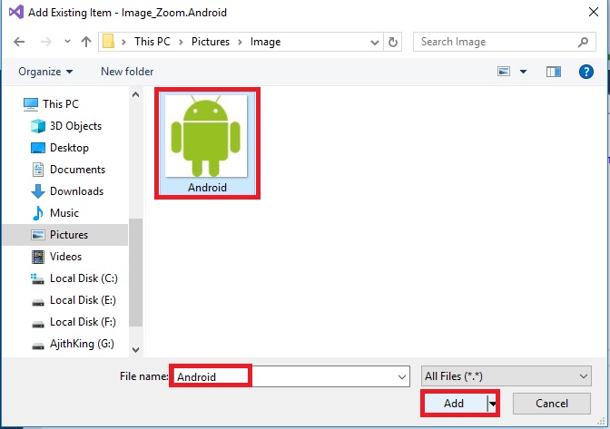 Next, add an image to Solution Explorer >> Project Name.Android >> Resources >> Right Click >> Drawable >> Add >> Existing Item. When we click an existing item button, it opens a dialogue box.
