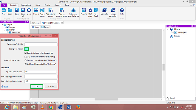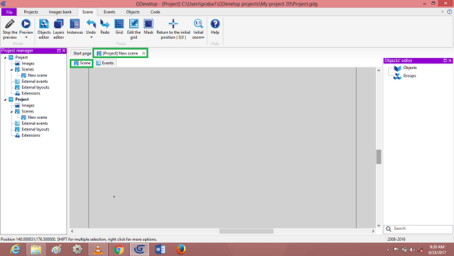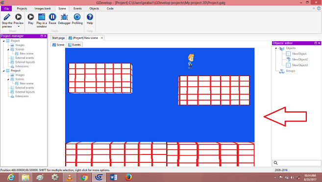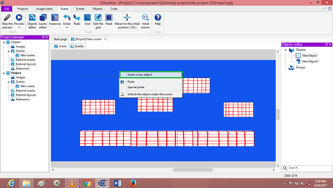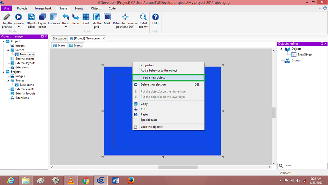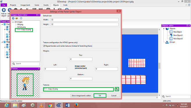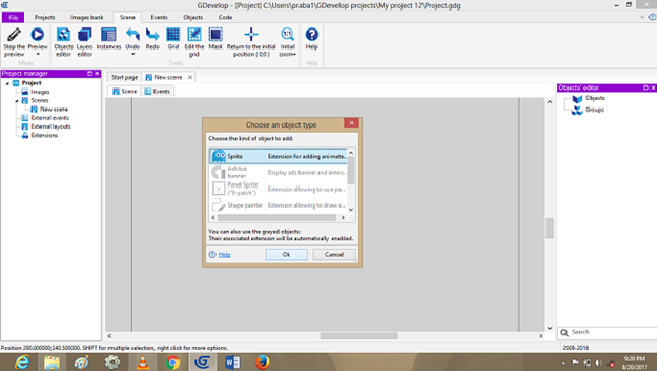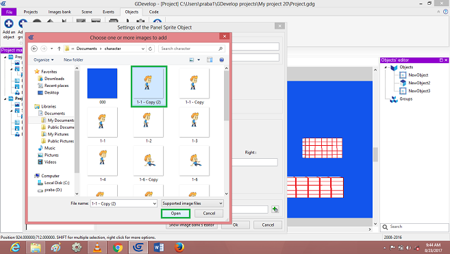 Click on->Sprite object, Default open dialog box, Edit player object, images to add in the Scene Layer.