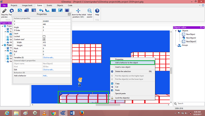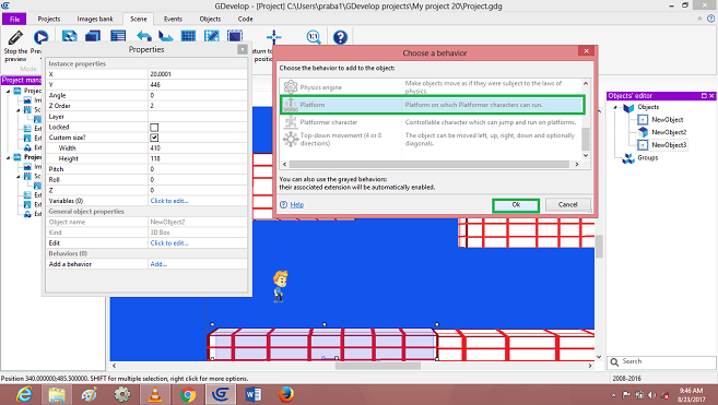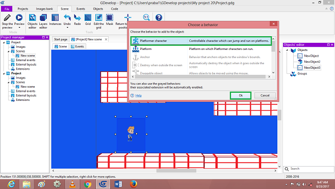 Again, Right Click on->Player object, Select Behavior->Platform Character. And then Click on->Ok….