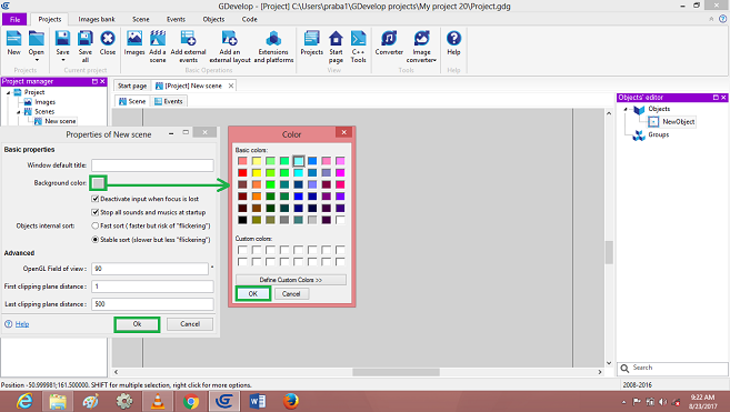 See New Scene conditions->Right click. After that a window will appear; change background color->after that click Ok.