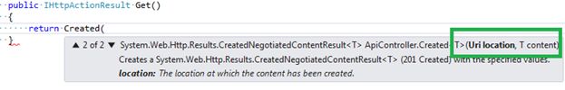 Created 	 	The status code for the Created status is 201 and generally the status is  	returned when the Post() operation is performed successfully. Created takes  	two parameters, one is the "uri" and the other is content.
