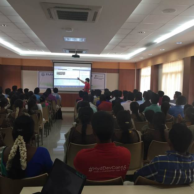 Next, the event was lead by Alagunila Meganathan, Professor at Paavai Institution, Executive Member of C# Corner Coimbatore Chapter, and Author of C# Corner on UWP. She was talking about Universal Windows Platform with Azure. She discussed Azure Data Centers and developed a universal app using Azure Mobile services which will help us to send push notifications.