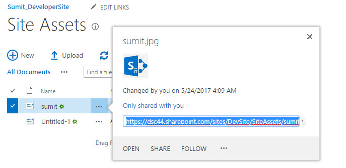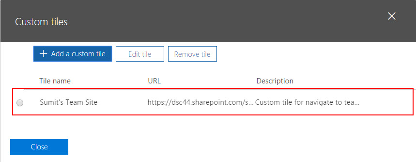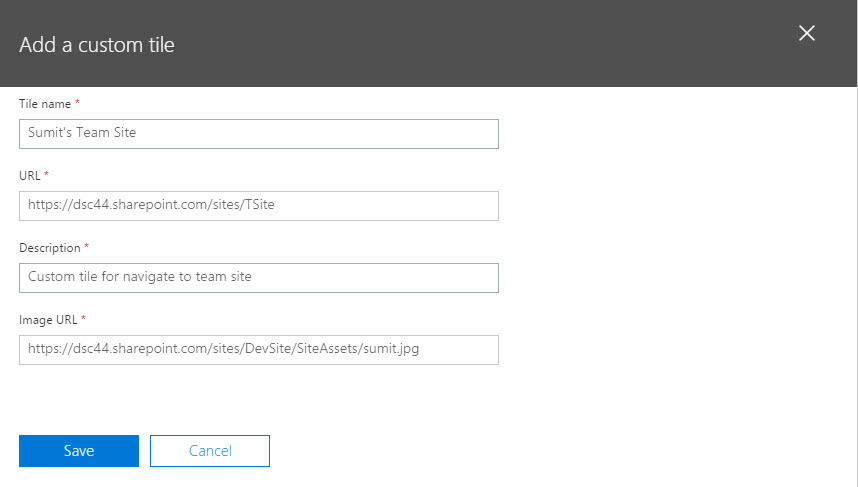 In the add a custom tile form, provide a require details such as tile name for custom tile, URL, tile description and image which will appear on tile icon.Choose image path from websites where you stored image as well as any SharePoint sites. Let’s go to copy image path from site assets page.