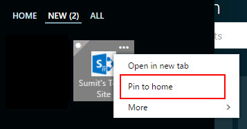 Your custom tiles get added into admin center. There are several option such as Open in new tab, Pin to home and more. Let’s go to admin center and pin it to home.