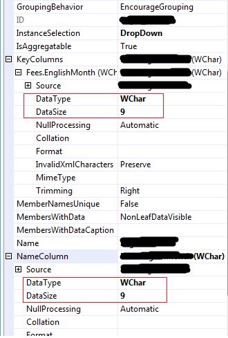 This error can be resolved by increase the value of the property called DataSize for the attribute under both NameColumn and KeyColumns. This can be achieved in 2 different ways.