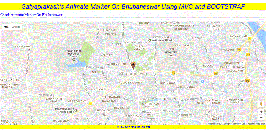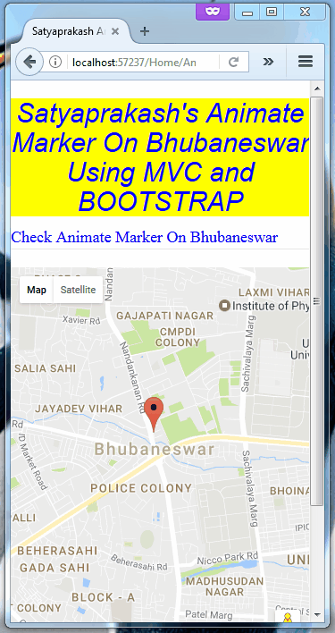 - <h2 style="background-color: Yellow;color: Blue; text-align: center; font-style: oblique">Satyaprakash's Animate Marker On Bhubaneswar Using MVC and BOOTSTRAP</h2>