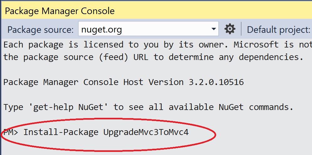 After Package Manager Console opens up, type the following command "Install-Package UpgradeMvc3ToMvc4"
