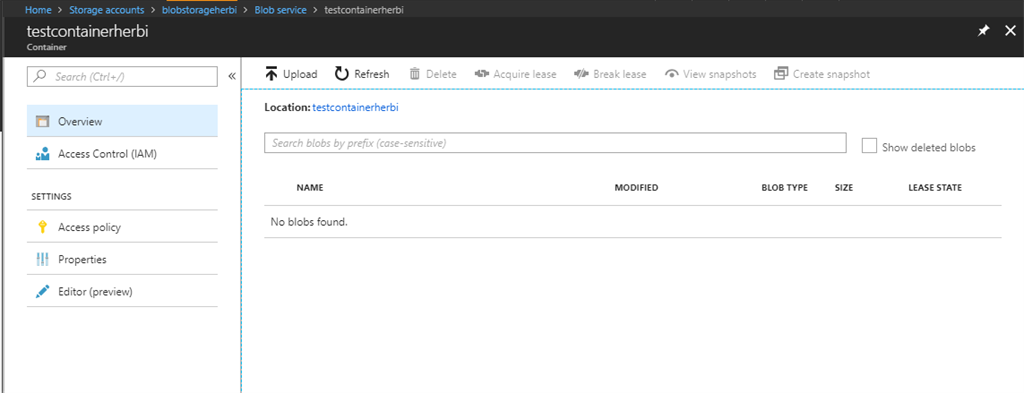 Next, create a container for the Blob to add files into the container using the Upload button, as shown below.