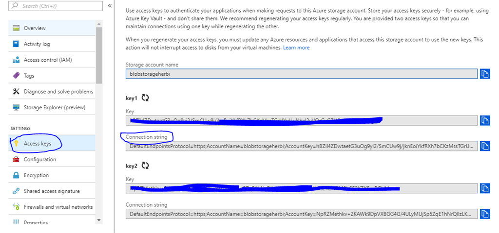 Navigate to the Storage Account (which you created) -> AccessKey, copy connection string which is used to connect to the Blob from C# code.