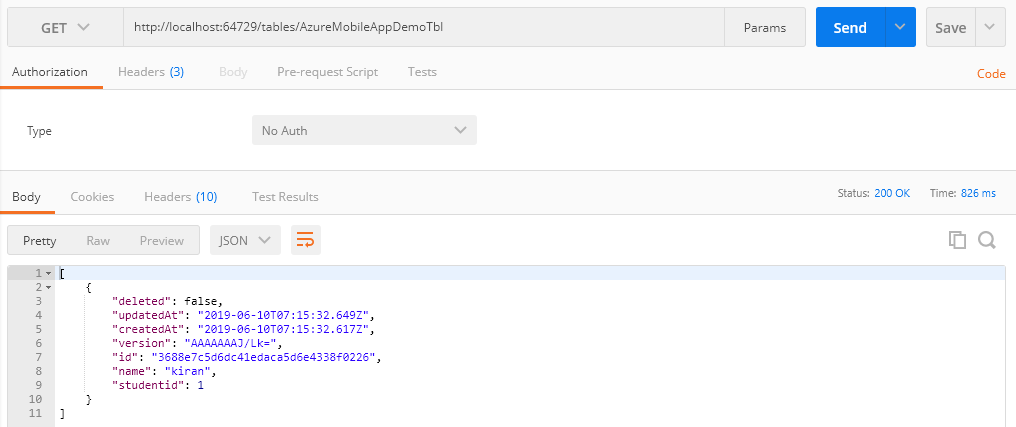 URL:-Http://localhost:64729/tables/AzureMobileAppDemoTbl