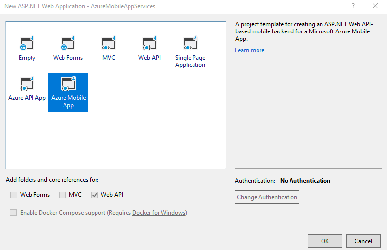 The second step is to select the Azure Mobile App and click on the Ok button. Please refer to the below figure.