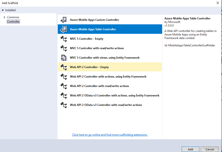 Once you click on the Add Button, it will start to do the Scaffolding process. After that, it will create AzureMobileAppDemoTblController with Post, Get, Patch, Delete methods.