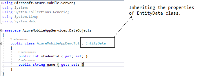 As of now in our class "AzureMobileAppDemoTbl" we have 2 properties such as student id and name. But we inherited EntityData class and for that reason, our class has the properties of EntityData(base) class also.