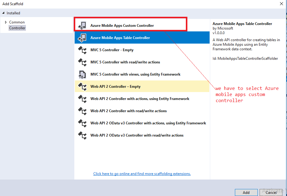 Please check the below figure. Select Azure Mobile Apps table controller.