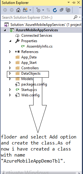 I have created a class and named it AzureMobileAppDemoTbl. Please see the below figure.