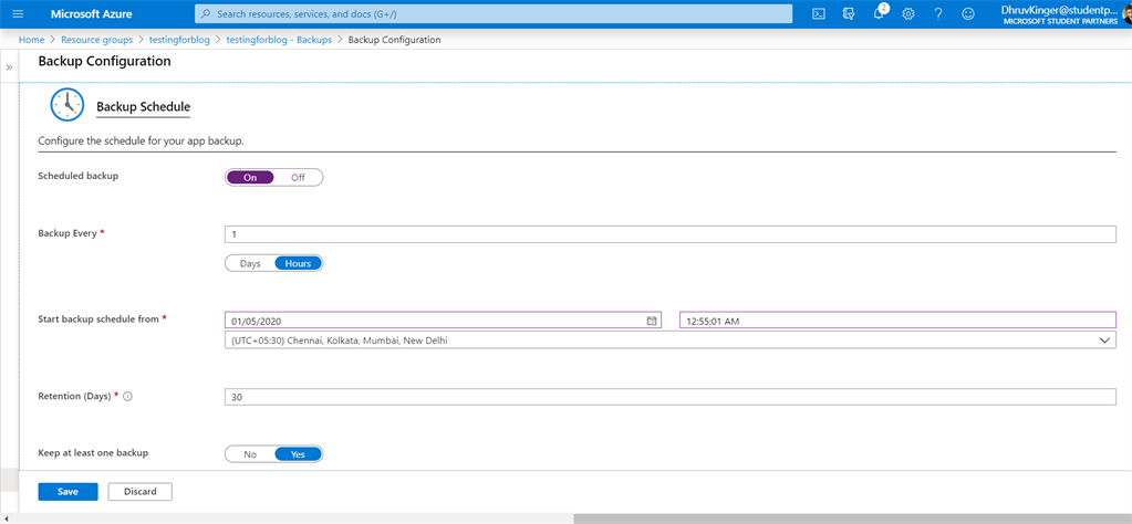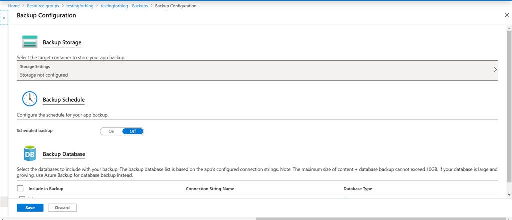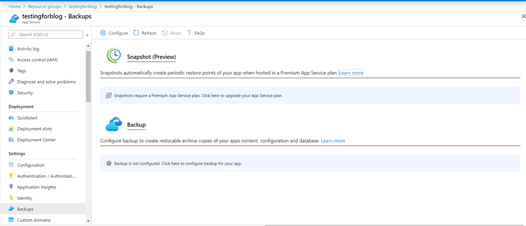 - In the Azure portal, navigate to your app's page, select Backups.