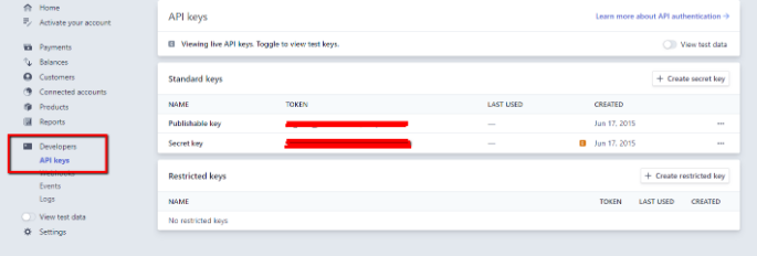 Before we go any further, in order for us to connect to the API we need to create the API keys. Once we have created an account, we have to click on Developers -> API keys, and from that page, we can get the API keys, secret and publishable key.