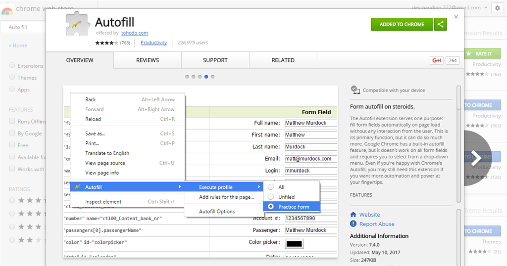 Autofill The most painful moment for a developer/tester is filling the whole form every time when testing or developing web pages. The Autofill extension serves to fill form fields automatically on page load without any interaction from the user. Fill in forms once and save them with auto form fill. It saves time from fill input field every time. But if you use any plugins for selecting or other input fields, this extension reacts with difficulty, so please check once before using this extension.