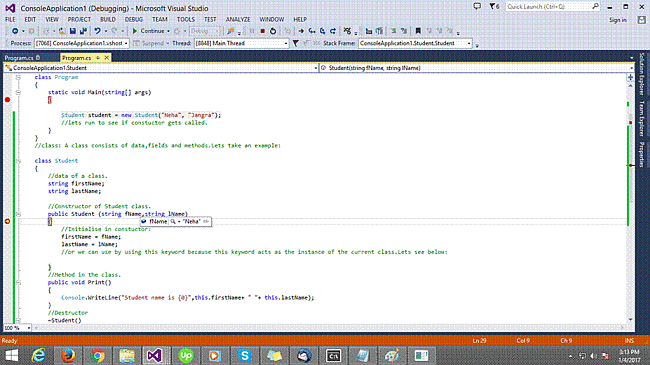 When we create an instance of class in the example above and run the program, then we can see by putting a breakpoint the constructor will be called at that point and values will be assigned to the data fields in the constructor only.