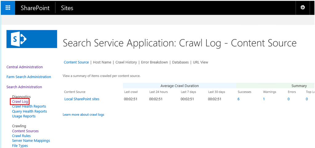 We can clear the index from Central Administration by going to the Search Administration page in the Search Service Application. If we click ‘Crawl Log’, we can see the details about the last crawl on the content sources.
