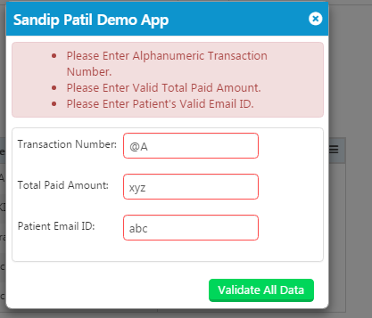 - <div class="divSandipPatilContents"> <input type="text" id="trasanctionNumber" /> <input type="text" id="totalPaidAmount" /> <input type="text id=" patienEmailID " />