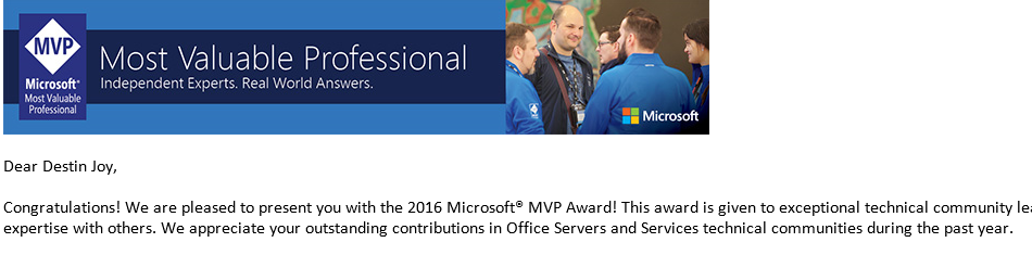 I'm ecstatic and delighted to share with you the following email received from Microsoft saying I've been awarded with MVP. I want to say huge thank you to Microsoft for giving me the award but I also want to thank YOU the community as without you guys none of this would be possible.