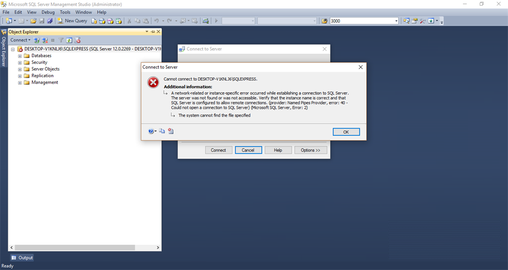 A network-related or instance-specific error occurred while establishing a connection to SQL Server. The server was not found or was not accessible. Verify that the instance name is correct and that SQL Server is configured to allow remote connections. (provider: Named Pipes Provider, error: 40 - Could not open a connection to SQL Server) (Microsoft SQL Server, Error: 2)