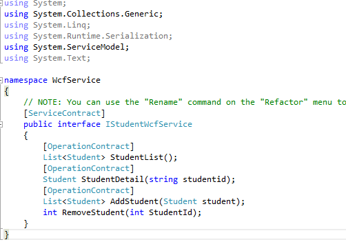 I am creating a WCF Service for students, which has four methods. I have added a [ServiceContract] attribute just before the IStudentWcfService interface. When client adds the reference of service or uses svc.utill utility command for generating the metadata or proxy, then this attribute functions and does an awesome job of taking the responsibility for creating the metadata of service, which would be available to the client.