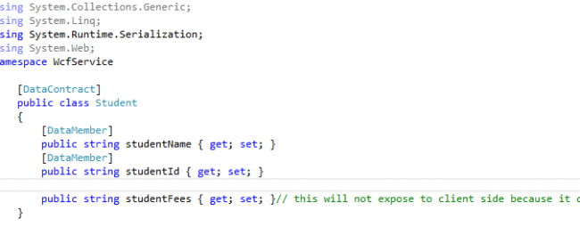 Now, it is clearly described that these two properties which are decorated with [DataMember] will be exposed and accessed by the client while the studentFees property would not be accessible by client.