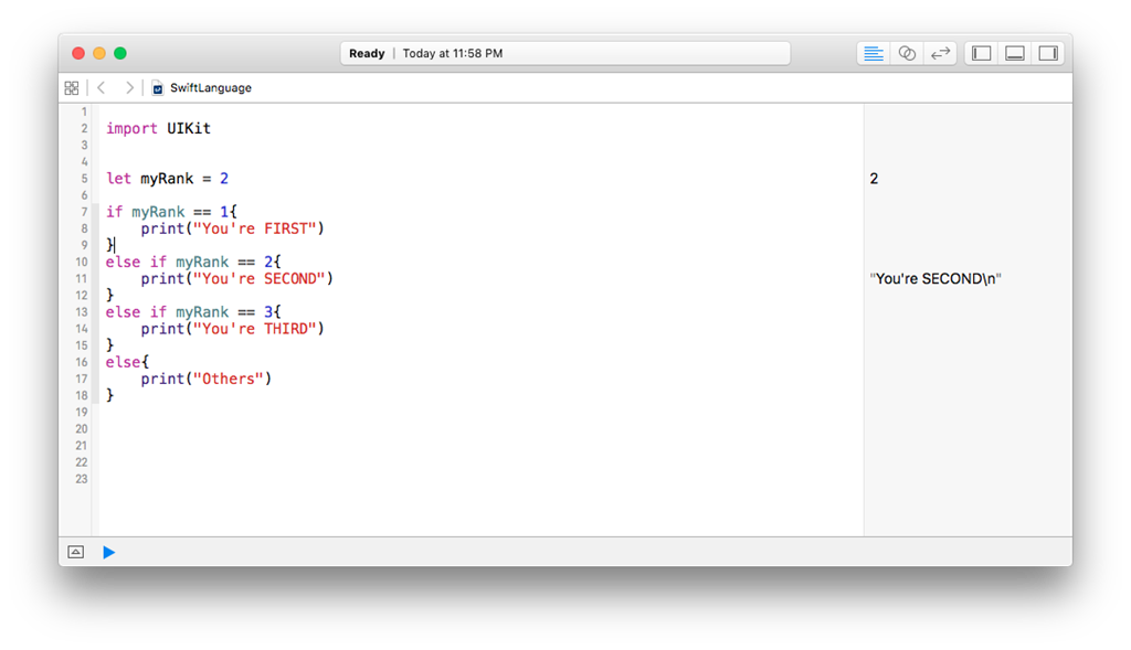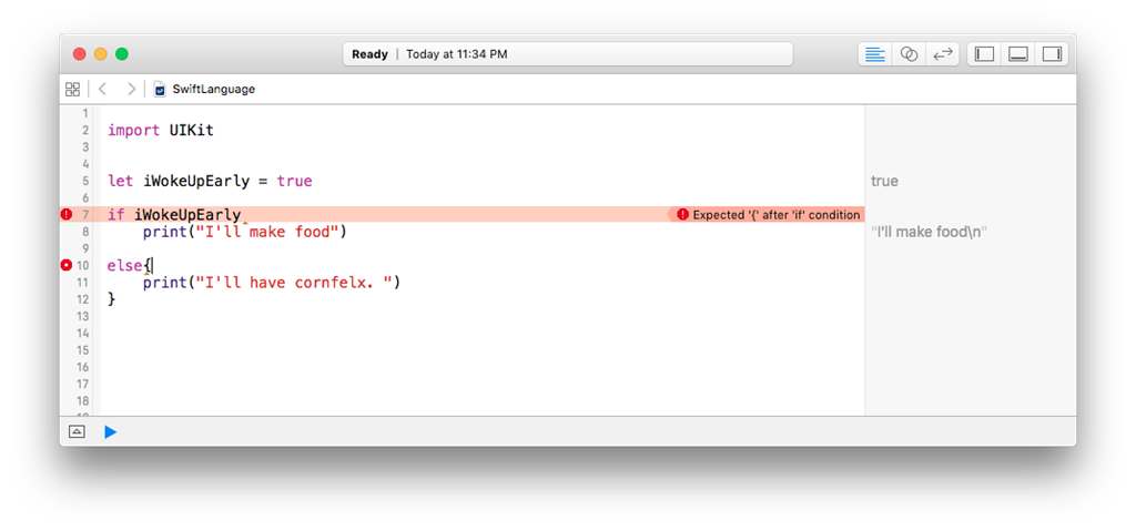 - Whether you have one line of code or two, you have to put those curly braces after condition. Apple thinks it enhances the readability of code.