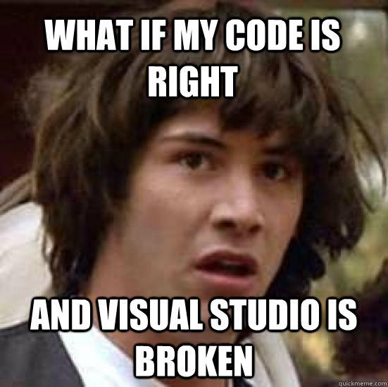 Okay, this is just for fun. I don’t really mean for visual studio to be broken. What I mean by this is no matter how complex your problem is, the solution always exist there. If one approach doesn’t work you try the other one. I remember myself doing one of my school assignment and I set up the network for VM’s in the virtual box but it didn't seem working. I checked everything again, everything’s perfect but still not working. Ok uninstall the VM’s, install it again, still not working. Uninstall the whole virtual box, install it again, set the network again but still not working. Like what the heck……It took me a whole day just to figure out that although I restarted the VM but forgot everytime to restart my PC just after setting up the network. (It makes me feel so stupid now). And I came to know that things actually sometimes work after restarting the PC. :D