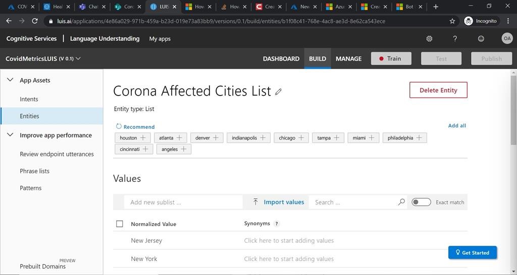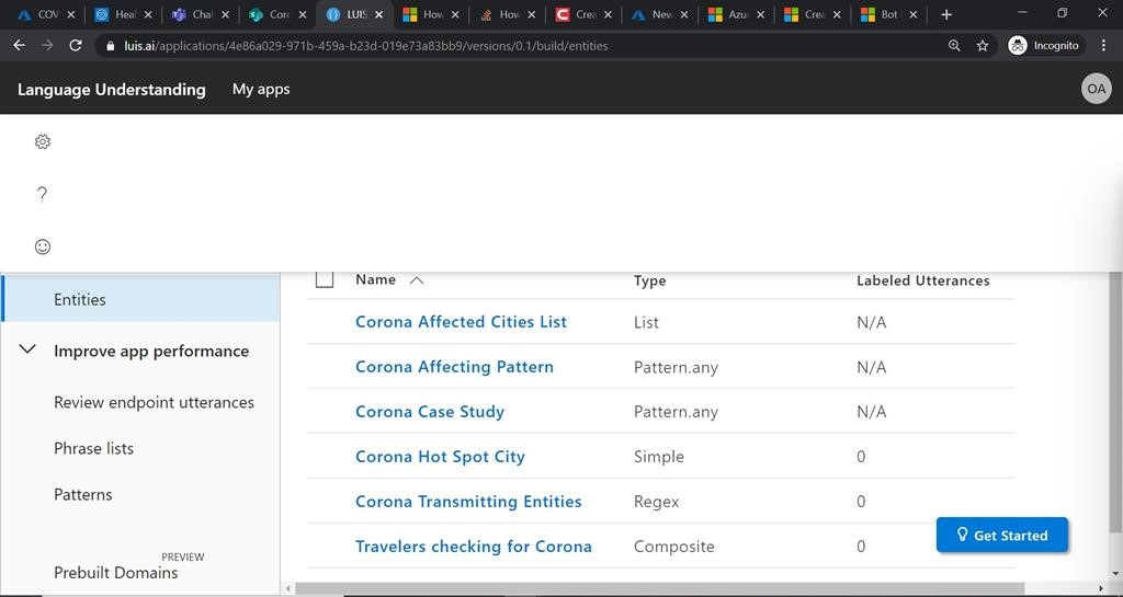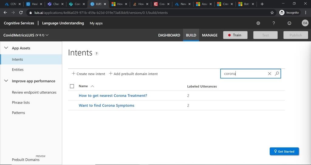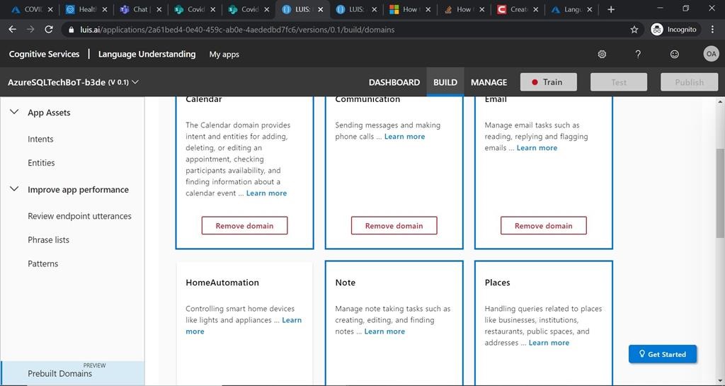 Automatically, your Intents and Entities sections are updated with items related to the above-selected Predefined Domains.
