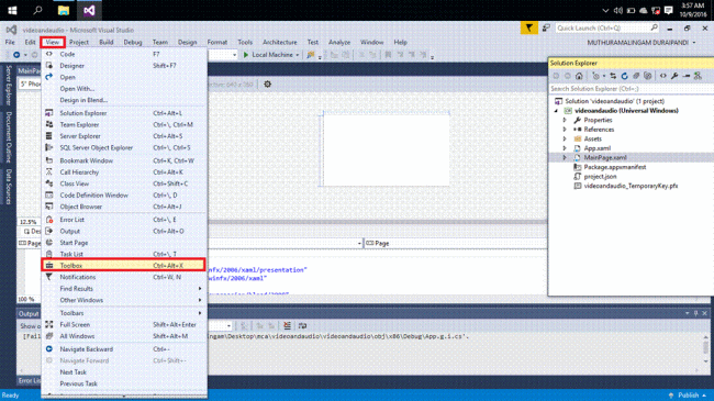 Here, we can go to View, select the toolbox, open the tool box and afterwards, you can click MediaElement button.