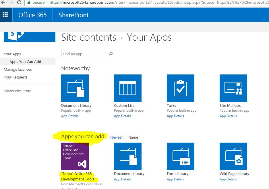 To install Napa, open your developer site and choose site contents > add an add-in > SharePoint store. In the store, search for Napa and install it. (If you have a Office 365 developer site, Napa may have already been installed when the site was created and you will see it on the site contents page.)