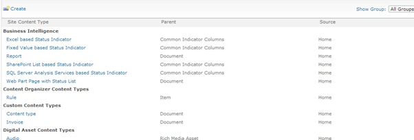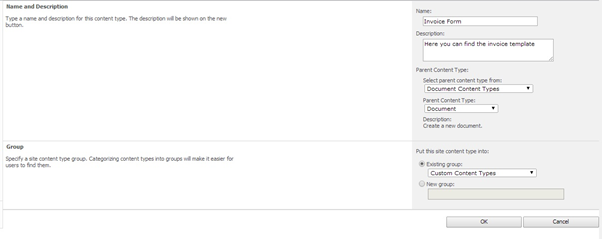 Note: Here should give the unique name, description and choose the correct parent content type and content type from, then place in the existing group.