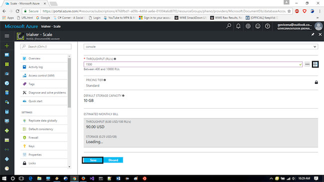 We can then set storage capacity to 10 GB if we need a single partition with throughput levels from 400-10,000 request units/second (RU/s); and we can select the storage capacity to 250 GB if we need a partition collections; and from that, we can manage handling unlimited amount of storage over multiple partitions.