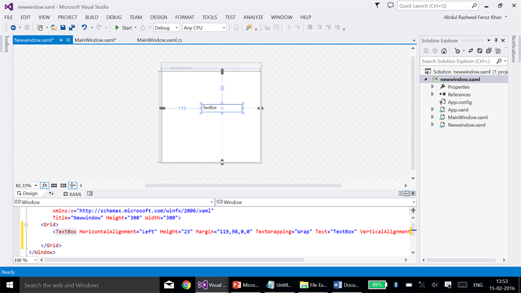 - <TextBox HorizontalAlignment="Left" Height="23" Margin="119,98,0,0" TextWrapping="Wrap"Text="TextBox" VerticalAlignment="Top" Width="120"/>