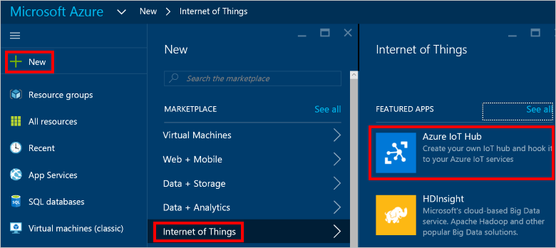 In the Jump bar, click New > Internet of Things > Azure IoT Hub.