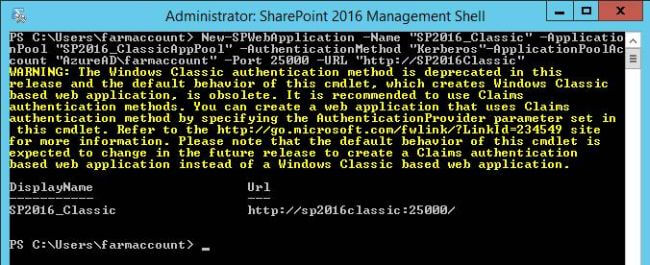 - New - SPWebApplication - Name "SP2016_Classic" - ApplicationPool "SP2016_ClassicAppPool" - AuthenticationMethod "Kerberos" - ApplicationPoolAccount "AzureAD\farmaccount" - Port 25000 - URLhttp: //SP2016Classic
