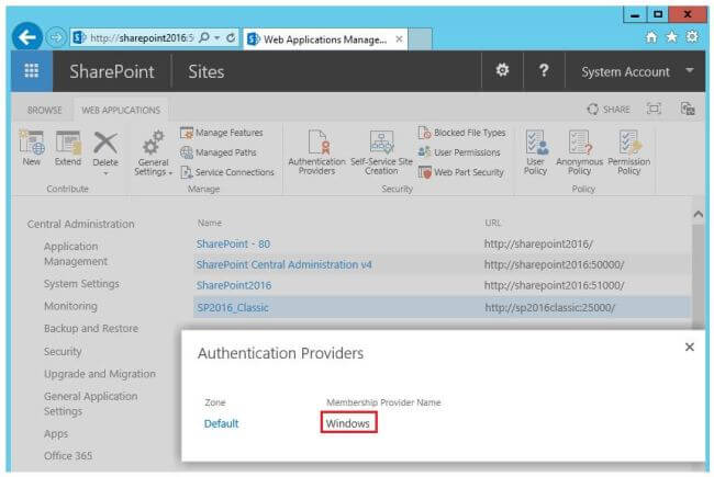 Heading back to the Web Application management page, we can see the Authentication provider for the new Web Application is Windows, which is a classic authentication provider.
