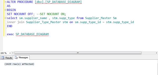 If we put NOCOUNT OFF used in stored procedure, then after the execution of the stored procedure; the message tab in SQL Server will show (1429 row(s) affected).
