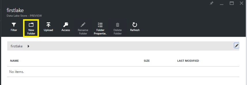 Step 3: Next, in your Data Lake Store account blade, click New Folder.