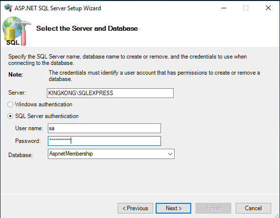Enter your SQL Express server name as <your Machine name \SQL Express> as shown below. Note that you can change the application services database name to your desired name (aspnetdb by default) and in this example, I have set the name to AspnetMembership.