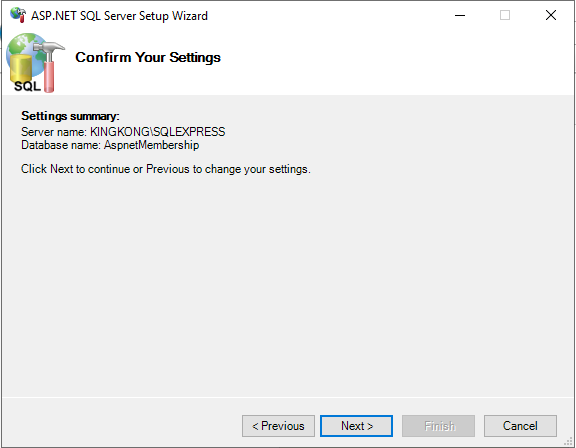 Selecting the Next button on the above window takes you to the confirmation window as below after successful installation of your application services database for ASP.NET.