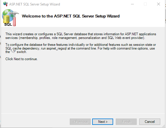 Run aspnet_regsql.exe utility from C:\windows\Microsoft.NET\Framework\v2.0.50727 folder on your machine. Selecting or double-clicking the aspnet_regsql.exe utility opens the wizard as below.
