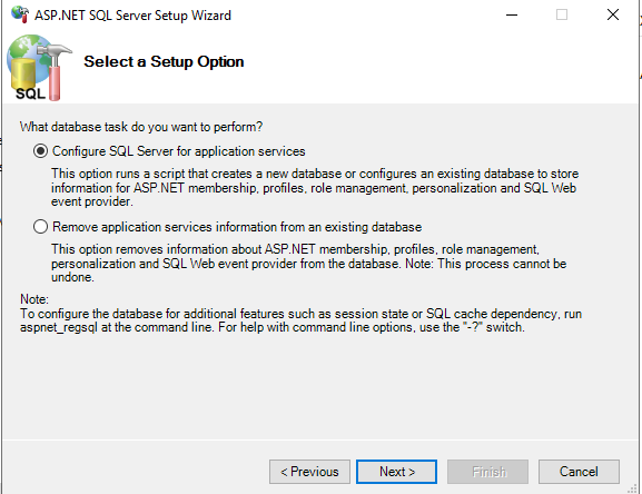 Selecting the Next button on the above window opens the next window where you can either configure SQL Server for Application services or remove Application services information from an existing database.