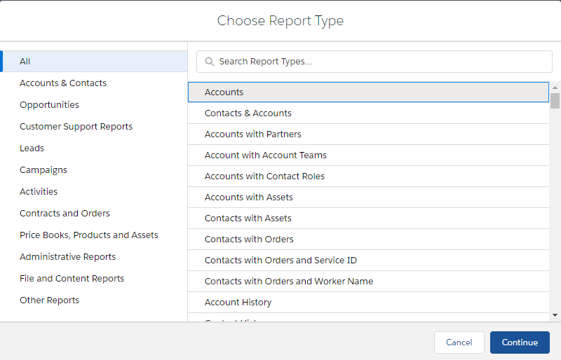 The New Report button will ask you to choose a report type. Choose a Report Type that you want to create and click on Continue button.